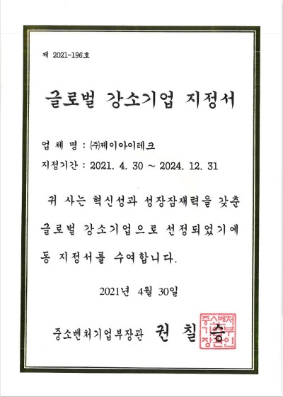 2021 글로벌 강소기업 지정서
