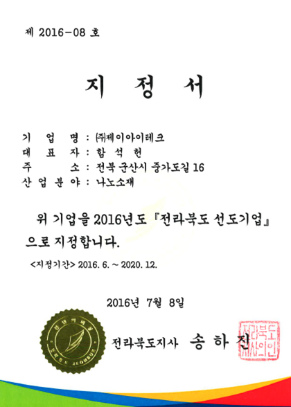 기관인증 지정서 최고관리자 2026-03-10 15:45:28 29 본문 지정서 목록 이전글 소재, 부품 전문 기업확인서 다음글 퍼스트펭귄형 창업기업 선정서 댓글 0 등록된 댓글이 없습니다.