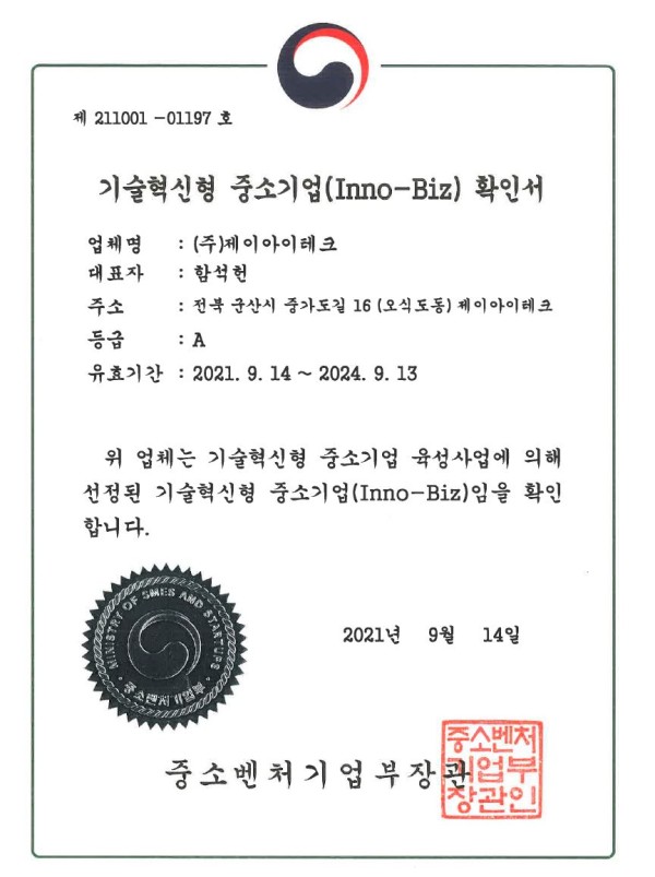 기관인증 기술혁신형 중소기업 확인서 최고관리자 2026-03-10 15:56:52 31 본문 기술혁신형 중소기업 확인서 목록 이전글 특허 10-2337085 호 다음글 2021 글로벌 강소기업 지정서 댓글 0 등록된 댓글이 없습니다.